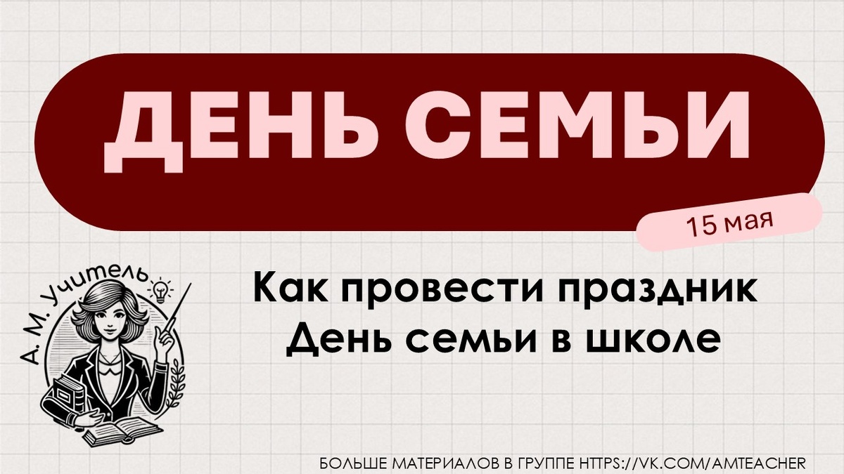 15 мая отмечается Международный День семьи – прекрасный повод устроить в школе добрый и запоминающийся праздник. В этот день можно укрепить семейные ценности, сплотить детей и родителей, а также создать атмосферу тепла и радости. Откройте праздник небольшим выступлением: Организуйте зоны, где дети и родители смогут вместе что-то создать: Проведите веселые соревнования: Оформите яркий уголок для фото с плакатами и табличками: Завершите праздник совместным чаепитием, где родители и дети смогут поделиться историями, традициями и просто пообщаться в неформальной обстановке. Хотите сделать праздник еще ярче? Скачайте бесплатные материалы в нашей группе ВКонтакте: