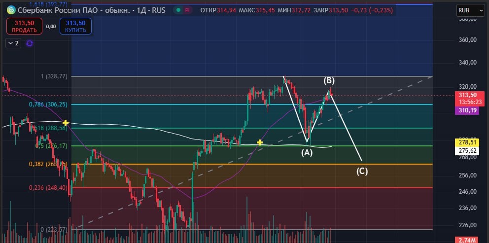 $SBER 🏦 Хорошо протащили наверх, пробили уровень 304, но до 327 так и не дошли. ▶️Как и ранее, Я всё-таки предполагаю, что идёт три коррекционных волны, в данный момент построено две и сейчас на графике формируется разворот и, вероятное начало, третьей коррекционной волны. 🔽Ближайшая поддержка 304, как только пробьёт и закрепится увидим падение до 286. 📉Если этот уровень тоже будет пробит тогда следующий уровень 273 и там уже будем разбираться, что происходит. ✔️Сменной плана будет пробитие уровня 327,16 и закрепление выше этого уровня, тогда увидим движение наверх. НЕ ИИР #теханализ #сбер #инвестиции