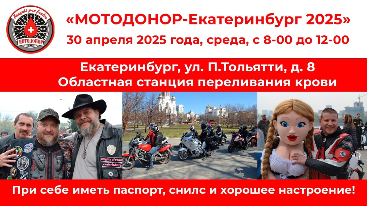 УЖЕ ЗАВТРА! 30 апреля 2025 года, среда, с 8-00 до 12-00 по адресу ул. П.Тольятти, д.8 – в Областной станции переливания крови. При себе иметь паспорт, снилс и хорошее настроение! Motorcycle •[ЕКБ] МОТО• #мотосезон2025 #екатеринбург #ekbmoto #moto Источник