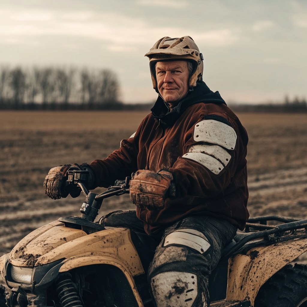 Создано на основе запроса: a silly, cinematic photograph of a profile shot of a middle age man ridding an ATV on an empty soy field