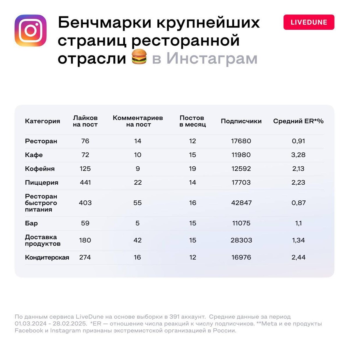 👀 Сервис LiveDune собрал данные по 491 Instagram-аккаунту* ресторанных проектов и вывел средние цифры по лайкам, охватам и количеству постов в месяц — удобно глянуть, где вы находитесь относительно рынка. Что интересного? 🍕 Пиццерии — короли лайков. В среднем 441 на пост. 🍰 Кафе — самые вовлечённые подписчики. Процент активной аудитории 3,28% — топ по рынку. 🍫 Кондитерские — на втором месте: 2,44% вовлеченных фолловеров. 🍟 Фастфуд — чемпион по числу подписчиков: 42 847 в среднем. 📱 В среднем аккаунты общепита выкладывают от 12 до 19 постов в месяц. *Meta и ее продукты Facebook и Instagram признаны экстремистской организацией в России.