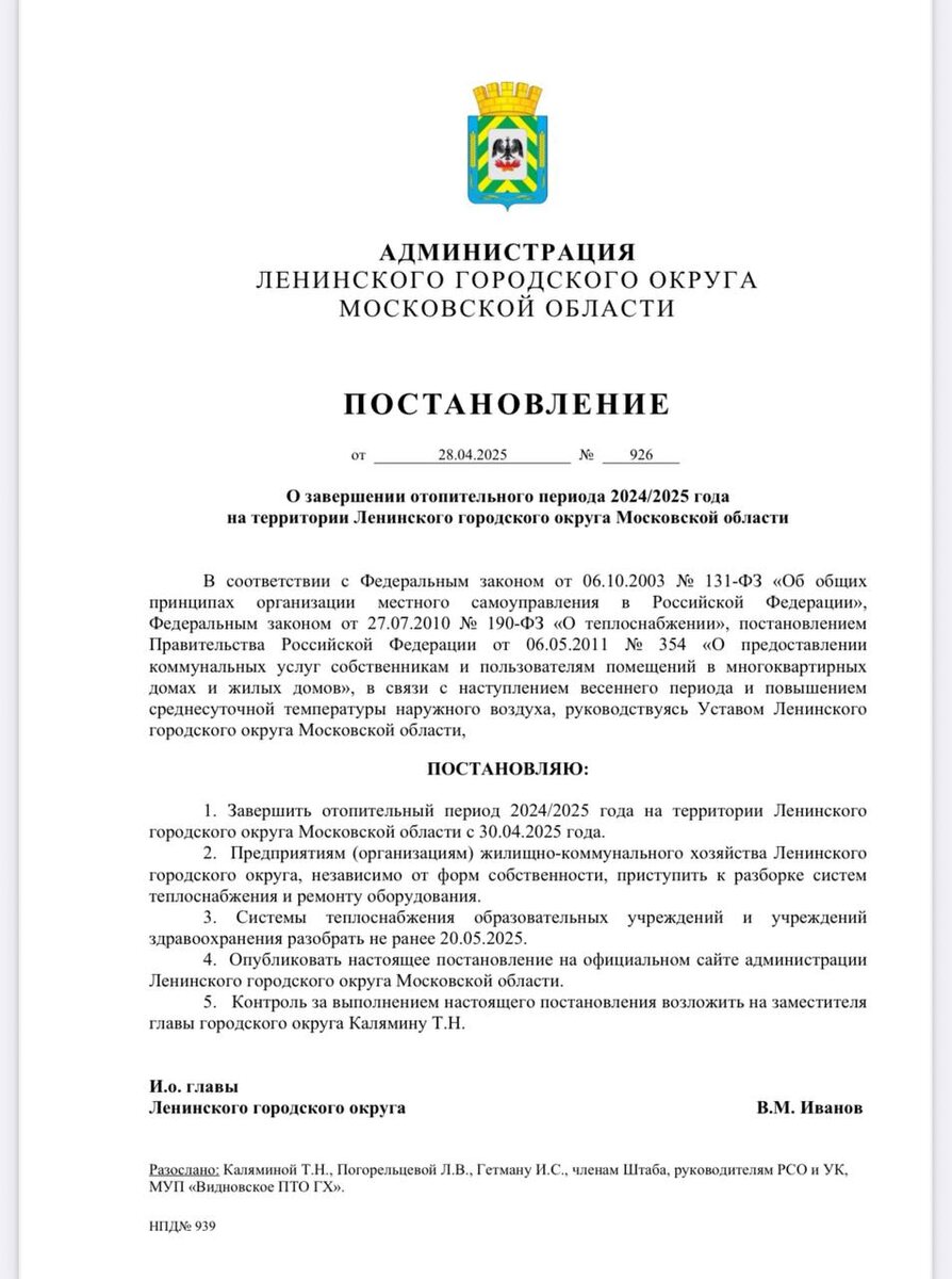 На сайте Администрации Ленинского ГО вчера вышло постановление о завершении отопительного сезона с 30 апреля 2025г.