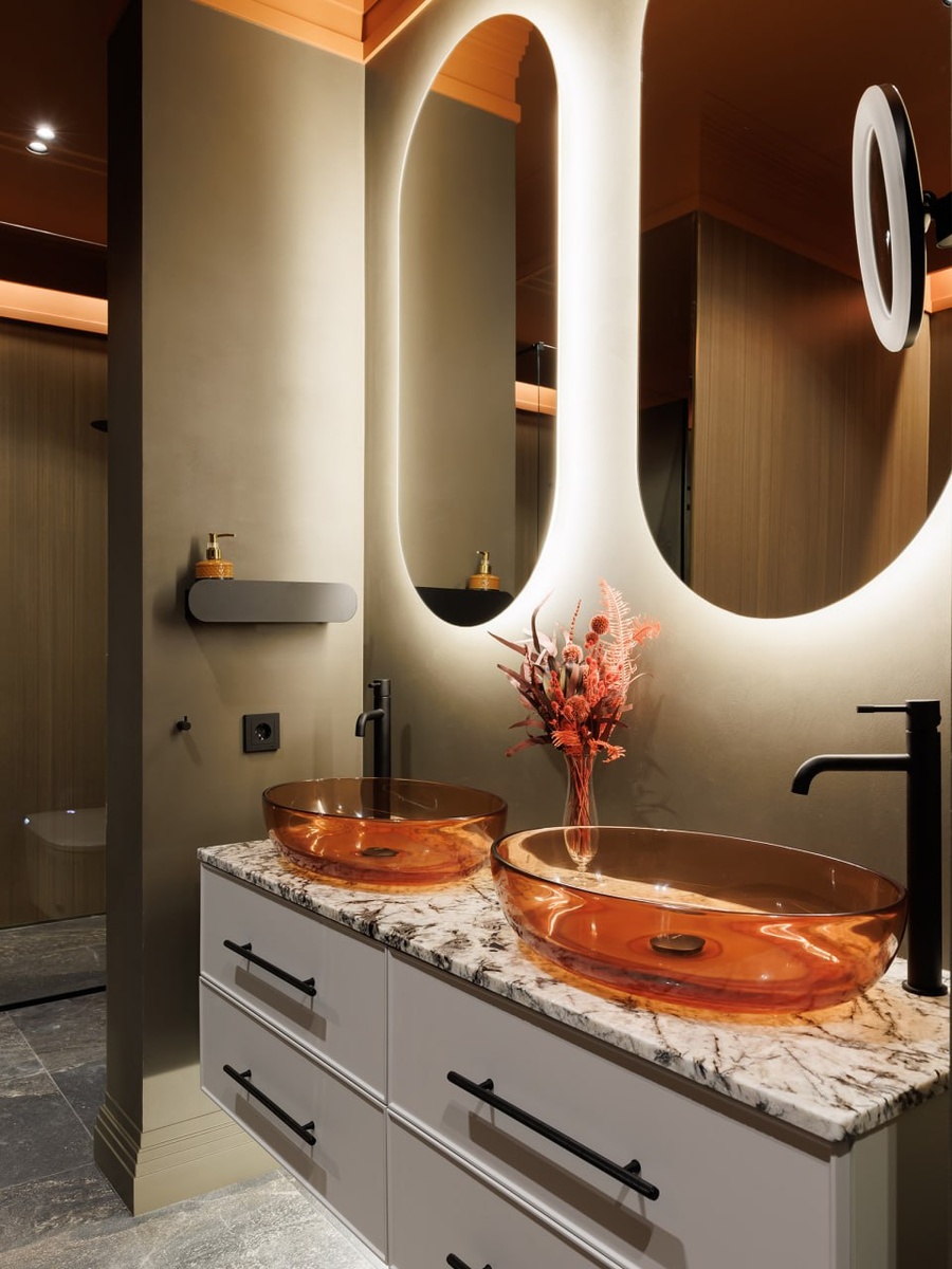 Плавные формы столешниц и полок, а также творческий подход к дизайну тумб и шкафов добавят ванной комнате уникальности и стиля. Дизайнеры советуют выбирать необходимые и функциональные предметы, так как простор в ванной гораздо важнее излишней загроможденности.