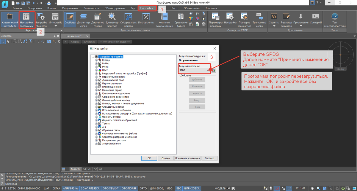 6. Перезагрузите nanoCAD для изменения параметров.