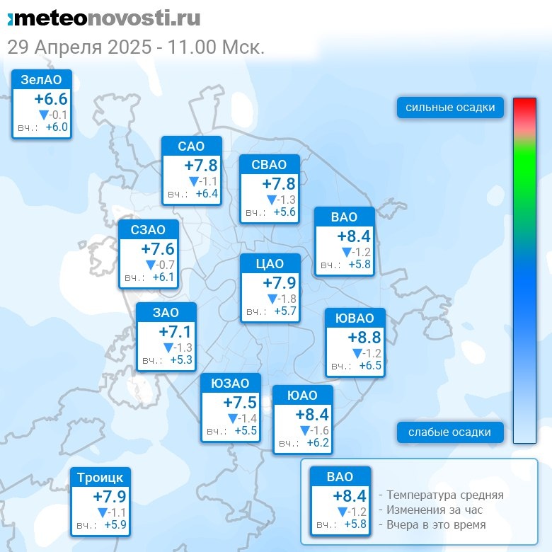 В 11:00 в Москве было от +6.2°C до +9.1°C, средняя температура +7.8°C #погода #Москва #весна #температура #29апреля #вторник