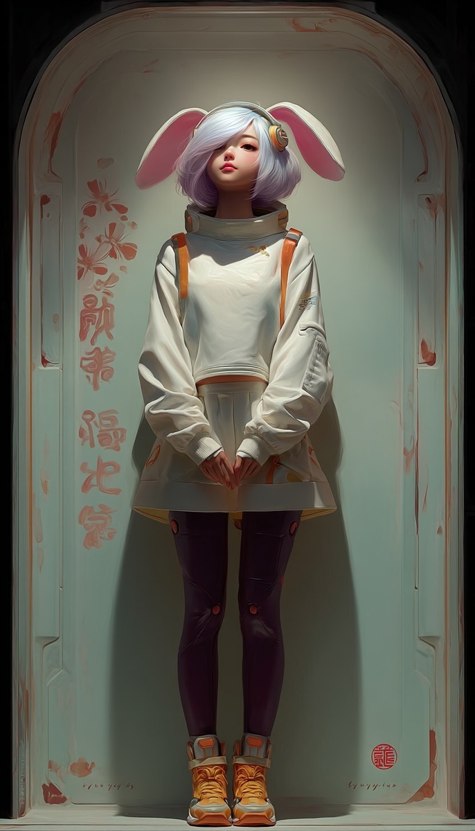 Автоперевод: Lycoris Cyber Pilot, "Lycoris 31", симпатичная китайская девушка в коротких плотных штанах, негабаритный свободный пуловер с длинными рукавами, серебряные волосы, великолепные изгибы, выходите из Mecha, пухлый, сплести, кабина, механические уши кролика, студийная фотография, игровой косплей