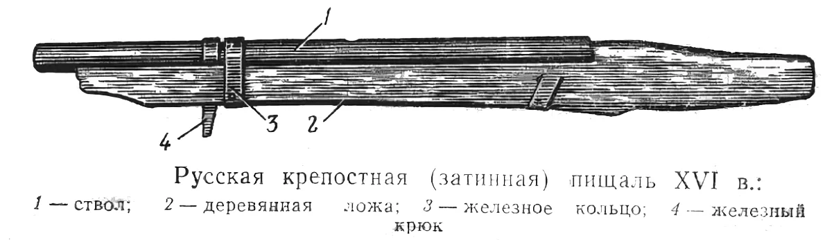 Достаточно важную роль в бою при Молодях сыграло огнестрельное оружие, и его было много. Пищаль - общее наименование старинных русских артиллерийских орудий прицельной (настильной) стрельбы и ручного огнестрельного оружия. Впервые упоминается в кон. 14 в., широкое распространение получила со 2-й пол. 15 в. Пищаль того времени, в отличие от пушки, имела более длинный ствол и меньший калибр. В 16 в. пищаль стала самым многообразным типом орудий. В зависимости от назначения они делились на стенобитные (осадные), затинные (крепостные) и полковые (полевые). Конницу хорошо уничтожали 7-ствольные пушки залпового огня («сороки»).