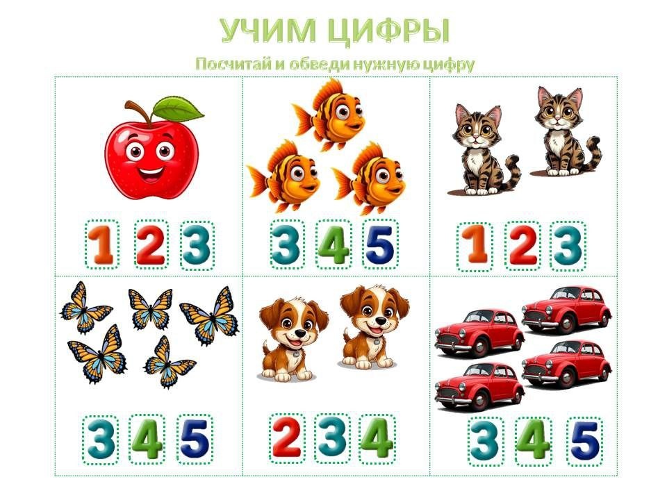 Такие задания очень нравятся детям: посчитай количество предметов - обведи подходящую цифру
