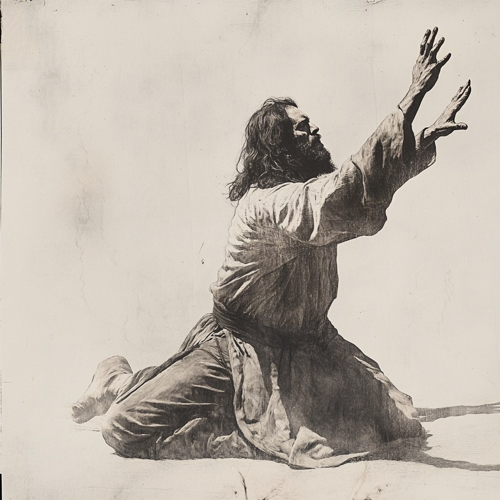 Создано на основе запроса: a man wearing a robe on one knee on the floor and the other leg up . Show his side profile and his face with long hair and a beard. He has his hands up raised more then his face protecting himself from a sword --- Автоперевод: Человек, носящий мантию на одном колене на полу, а другая нога вверх. Хорошо получилось? 🤔 https://dzen.ru/id/65c0c65c86e4f837c27b24d7 #ИИ #AI #нейросеть #midjourney #art