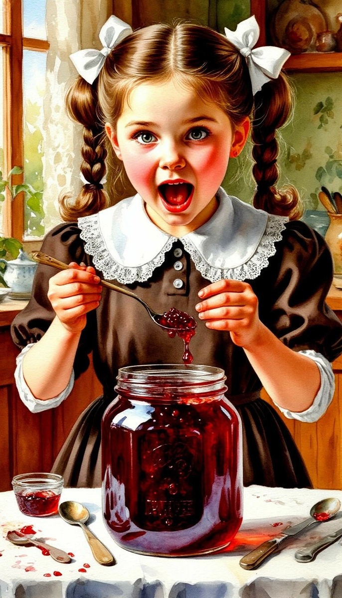 У меня есть несколько подписей к этому сюжету. Предложите свою. Soviet schoolgirl in a dark brown dress, white apron with straps, white collars, pigtails, white bows, on the table is a large glass 3-liter jar of jam, in her hands is a large wooden spoon with jam, with which she puts jam in her wide open mouth, she raised the spoon up, wants to eat, watercolor, Romero Redondo, Konstantin Razumov #neuroart #нейроарт #ai #ии #нейросеть #картинки #искусственныйинтеллект #цифровоеискусство #digitalart #арт #art #prompt #промпт #подсказка