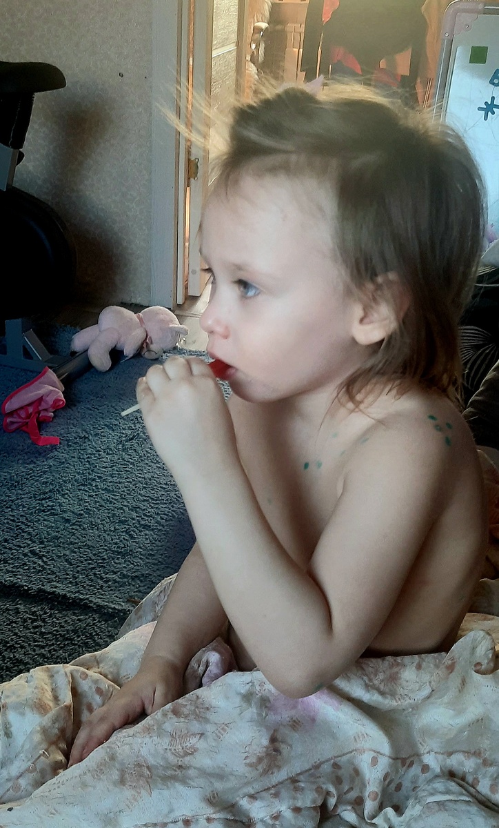Говорят, что лучше всего Ветрянной оспой переболеть в детстве. Ну вот и Алиса подхватила ветрянку. Карантин по ветрянке в детском саду, начался еще с 9 апреля. Ту неделю просидели дома с насморком. В понедельник сходили( один день), в садик и уже вечером заметили пару прыщиков на животе. Я как- то сразу поняла, что это "она". Прыщики были больше обычных и внутри прозрачная жидкость. Сегодня вызвали врача и он подтвердил наш диагноз. Мажемся , лечимся... Температура немного поднялась к вечеру 37,0. Но впринципе дочка хорошо себя чувствует. Прыгает, бегает, играет. Так же врач сказала, что на ночь можно дать что-то от аллергии, чтоб снять зуд. И в ванне сидеть нельзя, мочалкой тереть нельзя, только душ. Обычно новые высыпания появляются около 3х дней. Затем нужно отсчитать ещё 5 дней и уже можно идти за справкой к врачу и снова посещать детский сад. Будем надеяться, что у нас все пройдёт быстро и в лёгкой форме.