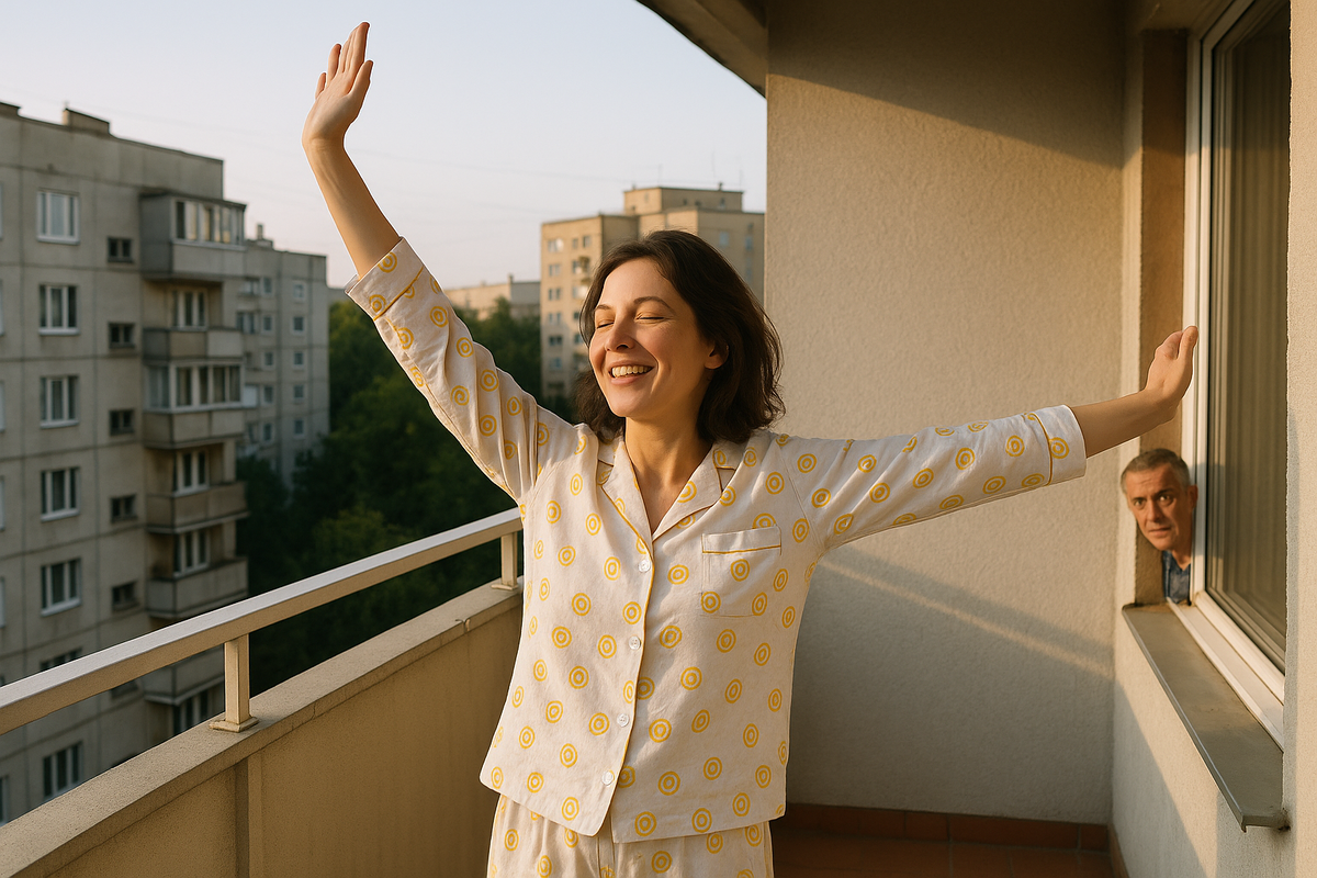 Зарядка - на балконе. В пижаме, под песню «Солнечный круг, небо вокруг». Сосед из окна напротив выглядел озадаченно.