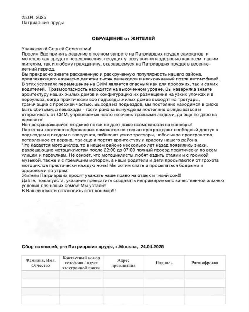 Жители «раскаченного» и «раскрученного» района Москвы обратились к мэру Сергею Собянину за помощью. Просят освободить Патриаршие пруды от самокатов и байков. В своем обращении к столичному мэру непростые москвичи пожаловались, что СИМ на Патриарших крайне травмоопасен из-за узких улочек, выходов подъездов на тротуары, граничащих с проезжей частью, нескончаемого людского потока, лишающего ездоков возможности маневрировать. Пешеходы вынуждены оглядываться и отпрыгивать. Возмущают жителей Патриарших и громкие звуки мотоциклов, которым несколько лет назад разрешили по ночами без ограничений рассекать по всем улицам района. Люди говорят, что шум прерывает их сон почти каждую ночь. «Мы хотим спать и просыпаться бодрыми и здоровыми по утрам!», — заявляют москвичи. Они просят Собянина обратить внимание на проблему, взывая к уважению их прав на отдых и тихий сон. Говорят, что самокатчики и байкеры создают для них «непримиримые с качественной жизнью условия», и что они устали от этого кошмара. С