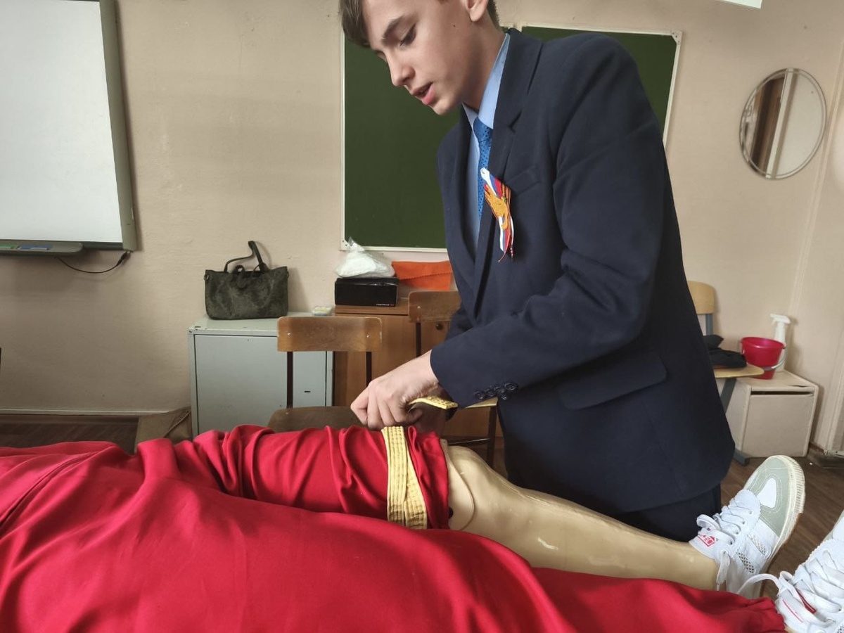#трек 8 "Санитарный батальон" "Монолит" МАОУ "Гимназия 11"Гармония" город Новосибирск Участники команды "Монолит" Ашомок Артём и Рогазинская Алла показали и рассказали об оказании первой медицинской помощи при артериальном течении в подколенной ямке и переломе предплечья. После оказания первой медицинской помощи манекену Максиму, ребята рассказали о подвиге нашей землячке Ольги Жилиной, которая на лыжах или на плащ-палатке, на собственных плечах выносила она из-под огня раненых. Её не раз видели с автоматом, в первой цепи атакующих. «Ты сестра или автоматчик?», – шутили бойцы