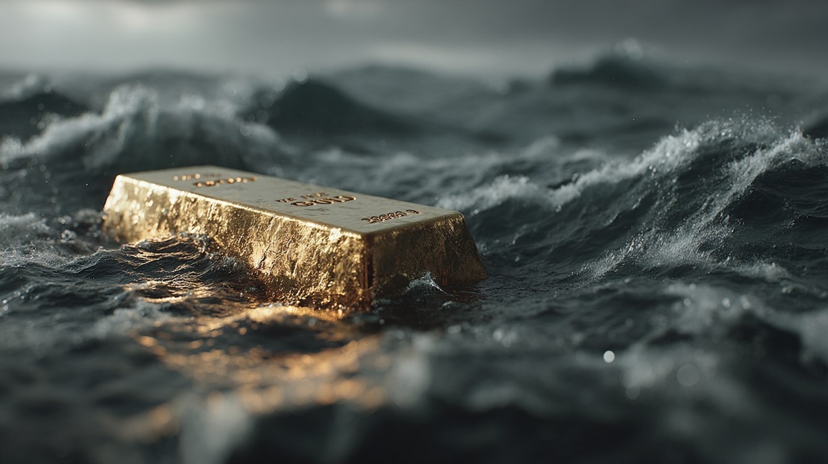 Создано на основе запроса: A highly symbolic cinematic scene showing a single gold bar placed on a stormy sea, glowing with golden light while waves crash around it, symbolizing gold as the final reserve of trust and safe harbor when the global economy is in crisis, powerful lighting, moody atmosphere, photorealistic style