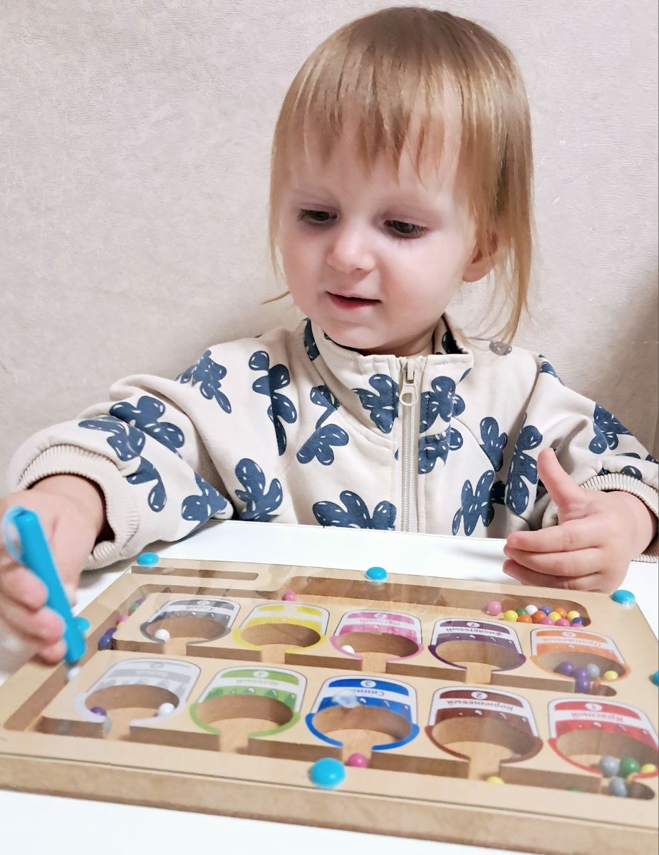 💙💛🧡💙💜🧡 Магнитный сортер по цветам — это увлекательная и развивающая игрушка для детей,которая помогает им изучать цвета,счёт,развивать мелкую моторику и логическое мышление.Основная идея заключается в том,чтобы сортировать шарики разных цветов и помещать их в соответствующие баночки с помощью ручки-магнита.💯💯 Софии пока что оказались не очень интересны правила игры.Скучно вести один шарик в определённое место.У неё своя тактика-заполнить баночку до конца,например. Или потрясти досочку и с баночек вывести шарики в самый низ.🤷♀️ Ну а я и не настаиваю,пускай детё развивается в своём режиме,спешить нам некуда,да и Москва не сразу строилась.👌