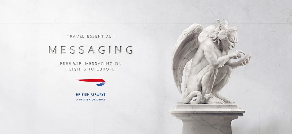 Так British Airways решил высечь в камне свои преимущества. На наружной рекламе представлен современный взгляд на классические скульптуры. Здесь ангел с паспортом символизирует удобство полетов из трех лондонских аэропортов, а горгулья со смартфоном — доступность Wi-Fi.