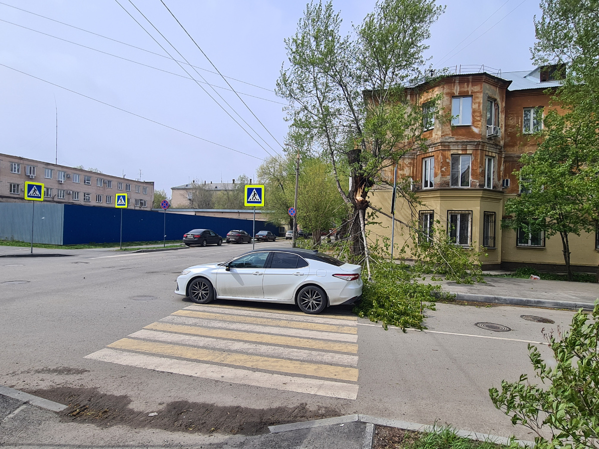 Крупная ветка дерева, сломавшаяся от сильного ветра, упала на багажник легковушки Тойота Камри. Произошло это сегодня, 29 апреля, около 13.30 часов на улице Яблочкина в Челябинске. Водитель проезжал через пешеходный переход, когда порыв обломил ветвь. Если бы по дороге шли пешеходы, все могло бы закончиться серьезными травмами людей. Пострадавший автомобиль получил механические повреждения, водитель вызвал ГАИ для фиксации ущерба. Сегодня в Челябинске порывы ветра достигают 19 метров в секунду, местами идет снег. Учитывая непогоду будьте осторожнее.