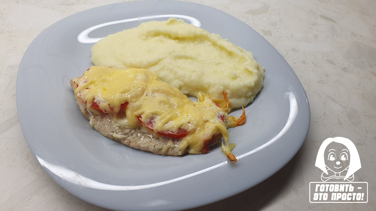 Всем привет! Сегодня я хочу поделиться с вами полюбившимся мне блюдом – грудка отбивная с помидором и сыром. Готовится просто и быстро. Мясо получается сочным и нежным – отличный вариант для обеда или ужина. В качестве гарнира я предлагаю приготовить картофельное пюре. Готовьте и вы вместе со мной! Обязательно пишите свое мнение о рецепте в комментариях. Фотоотзывы приветствуются!👀 Видео-рецепт на моем ютуб-канале «Готовить – это ПРОСТО!»: https://youtu.be/lDUY5_vMnZo Для пюре: Картофель очистить и нарезать на мелкие кусочки, чтобы он быстрее сварился. Поместить картофель в кастрюлю с водой, добавить немного соли и поставить кастрюлю на огонь. Варить пока картофель не станет мягким. Форму для запекания смазать растительным маслом или застелить бумагой для выпекания. Каждый кусочек филе разрезать вдоль на две части, стараясь не делать их слишком тонкими. Каждый кусочек филе накрыть пищевой плёнкой и отбить с кухонным молоточком с двух сторон. Затем филе посыпать и обтереть специями
