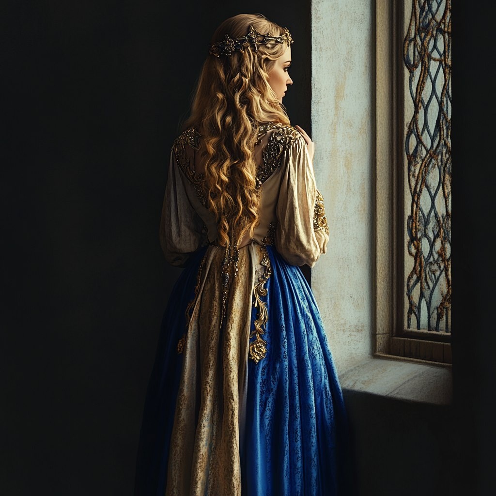 Создано на основе запроса: medieval princess woman looking outside a window, back view, cref