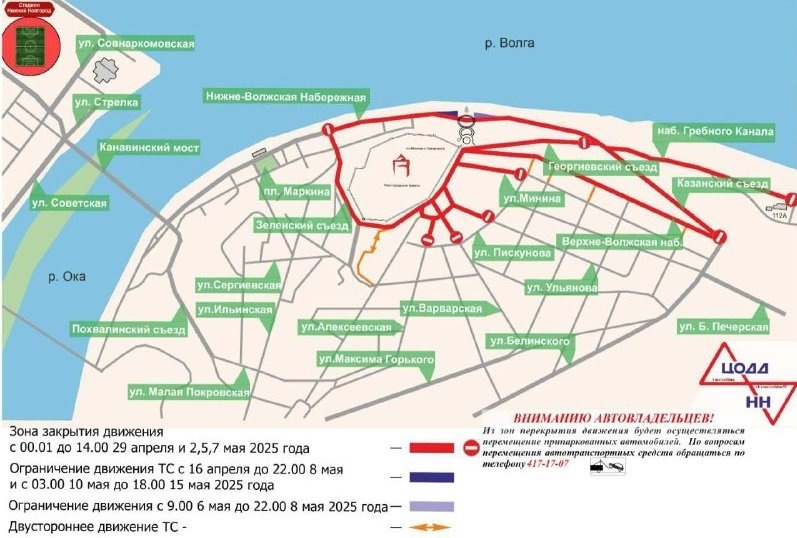 Также с 26 апреля до 22:00 8 мая и с 3:00 10 мая до 18:00 15 мая будет закрыта парковка на Нижне-Волжской набережной, расположенная слева от «Катера Герой» возле Чкаловской лестницы. А с 09:00 6 мая до 22:00 8 мая стоянку запретят справа от «Катер Герой» в районе Чкаловской лестницы. Водителям рекомендуют быть предельно внимательными.
