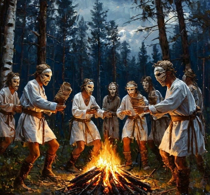 Посреди пылал костёр, да какой! Выше, нашего с бабкой, дома кострище. Вокруг костра шли два круга хоровода, один навстречу другому. Парни и девки в белых рубахах, с простыми волосами, украшенными венками из лазоревых цветиков, да с покрытыми масками из бересты лицами. Хорошо плясали. Поодаль играли музыканты. Нас заметили, поднесли по чарке медовухи, даже Сяву не обделили, и увлекли в ручеек.