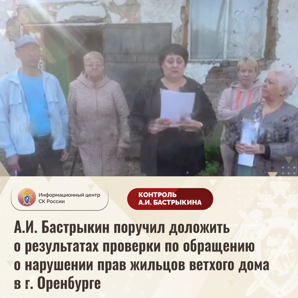 А.И. Бастрыкин поручил доложить о результатах проверки по обращению о нарушении прав жильцов ветхого дома в г. Оренбурге В социальной сети размещено видеообращение к Председателю СК России А.И. Бастрыкину от жильцов многоквартирного дома по улице 1 Мая в городе Оренбурге. Целостность кровли здания, 1959 года постройки, нарушена, подвалы и жилые помещения систематически затапливаются, межэтажные перекрытия обрушаются, на стенах образовались трещины и плесень, в квартирах появились насекомые и грызуны. Физический износ конструкций превышает 80%, однако в признании строения аварийным и подлежащим расселению гражданам отказано, меры к организации ремонтных работ не принимаются. Жильцы, среди которых пенсионеры, инвалиды, многодетные семьи и семьи участников СВО, опасаются за жизнь и здоровье, однако их многочисленные обращения в различные инстанции результатов не принесли. В СУ СК России по Оренбургской области по данному факту организована процессуальная проверка. Председатель Следственн