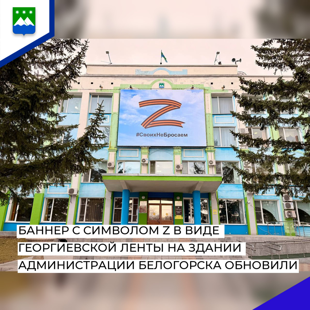 В преддверии празднования 80-летнего юбилея Победы в Великой Отечественной войне на здании администрации Белогорска обновили баннер с изображением символа спецоперации Z в виде георгиевской ленты и #своихнебросаем.