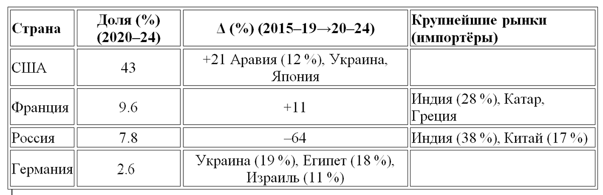 Например, США занимает почти половину рынка (под всё тем же знакомым лозунгом «Америка должна быть первой!»). Франция постепенно увеличивает свою долю (9,6%) на индийском и ближневосточном направлениях. А Россия с 7,8% рынка заметно отстала – экспорт упал на 64% за пять лет. SIPRI связывает это с приоритетом поставок войскам и «многосторонними санкциями» Запада: «решение России было отдать приоритет производству основных видов вооружений для собственных ВС, а также последствия западных санкций…». Как выразился глава «Ростеха» Сергей Чемезов, данные SIPRI «просто из пальца высасываются», ведь Россия такие цифры не публикует.