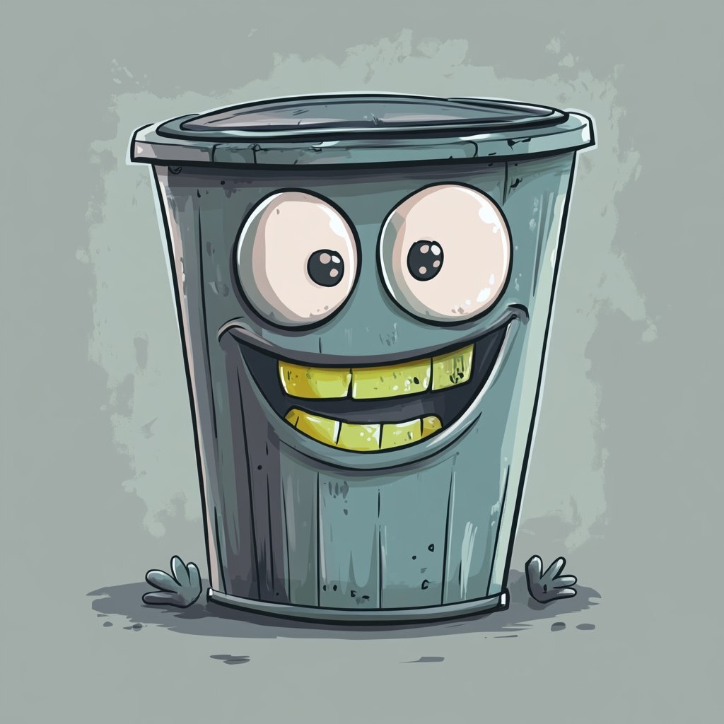 Создано на основе запроса: A hand-drawn, cartoon-style trash can with a silly and goofy expression
