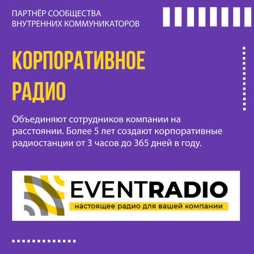 Партнёр АНТИКОНФЫ-5 и Сообщества внутренних коммуникаторов Eventradio.ru — корпоративное радио. Вот что они говорят о себе: «Наша миссия — объединять сотрудников компании на расстоянии играючи. Из вашей переговорки или из нашей студии. Более 5 лет мы создаём корпоративные радиостанции от 3 часов до 365 дней в году. Мы умеем в радио всё. Опыт сотрудников свыше 15 лет. Берём на себя полную реализацию: от радиоэфира до сайта вещания. Десятки довольных, дружных команд по всей стране и за ее пределами. АйТи. Строители. Производство. Юристы. Высотники. Мы сделаем максимум!» Подробную информацию можно УЗНАТЬ НА САЙТЕ либо на нашем мероприятии 14 мая в Москве. ➡ КУПИТЬ БИЛЕТ