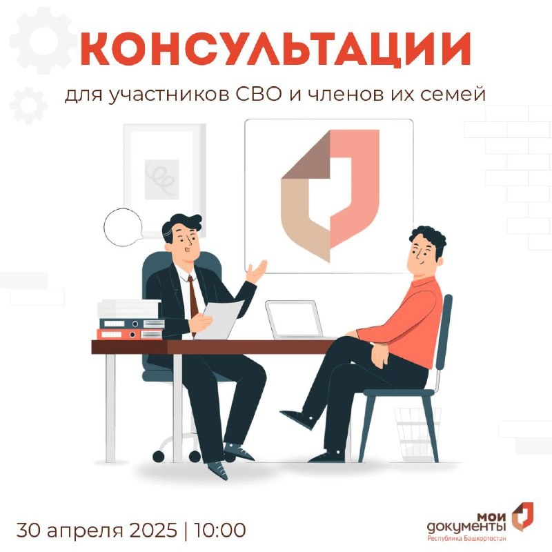 Консультации для участников СВО и членов их семей 🎎 30 апреля 2025 года в МФЦ с. Раевский состоится консультация по вопросам предоставления мер поддержки участникам СВО и членам их семей. У вас будет возможность: 🍒 Получить подробную консультацию по всем интересующим вопросам от специалистов 🍓 Узнать информацию о мерах государственной поддержки для участников СВО и их семей 🍑 Разобраться в возможностях для развития собственного бизнеса: льготных кредитах, грантах и других программах поддержки 📎 В мероприятии примут участие специалисты МФЦ, бизнес-шериф и социальный координатор государственного фонда «Защитники Отечества». 🗺 Место проведения: с. Раевский, ул. Ленина, д .111 (отделение МФЦ) 🕖 Время: 30 апреля 2025 года в 10:00 #МФЦБашкортостана