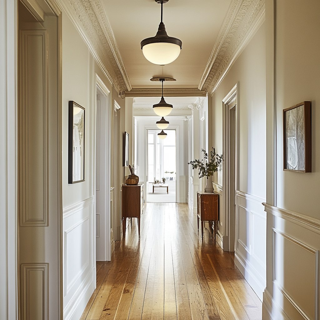 Создано на основе запроса: A long, traditional hallway in a Victorian-era home with high ceilings, white crown mouldings, and wooden floors
