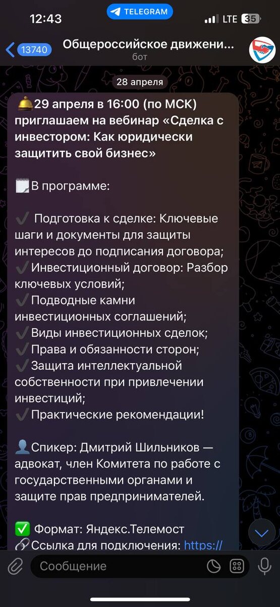 Β π29 Π°ΠΏΡΠ΅Π»Ρ Π² 16:00 (ΠΏΠΎ ΠΠ‘Π) ΠΏΡΠΈΠ³Π»Π°ΡΠ°Π΅ΠΌ Π½Π° Π²Π΅Π±ΠΈΠ½Π°Ρ Β«Π‘Π΄Π΅Π»ΠΊΠ° Ρ ΠΈΠ½Π²Π΅ΡΡΠΎΡΠΎΠΌ: ΠΠ°ΠΊ ΡΡΠΈΠ΄ΠΈΡΠ΅ΡΠΊΠΈ Π·Π°ΡΠΈΡΠΈΡΡ ΡΠ²ΠΎΠΉ Π±ΠΈΠ·Π½Π΅Ρ» πΠ ΠΏΡΠΎΠ³ΡΠ°ΠΌΠΌΠ΅: βοΈ ΠΠΎΠ΄Π³ΠΎΡΠΎΠ²ΠΊΠ° ΠΊ ΡΠ΄Π΅Π»ΠΊΠ΅: ΠΠ»ΡΡΠ΅Π²ΡΠ΅ ΡΠ°Π³ΠΈ ΠΈ Π΄ΠΎΠΊΡΠΌΠ΅Π½ΡΡ Π΄Π»Ρ Π·Π°ΡΠΈΡΡ ΠΈΠ½ΡΠ΅ΡΠ΅ΡΠΎΠ² Π΄ΠΎ ΠΏΠΎΠ΄ΠΏΠΈΡΠ°Π½ΠΈΡ Π΄ΠΎΠ³ΠΎΠ²ΠΎΡΠ°; βοΈΠΠ½Π²Π΅ΡΡΠΈΡΠΈΠΎΠ½Π½ΡΠΉ Π΄ΠΎΠ³ΠΎΠ²ΠΎΡ: Π Π°Π·Π±ΠΎΡ ΠΊΠ»ΡΡΠ΅Π²ΡΡ
