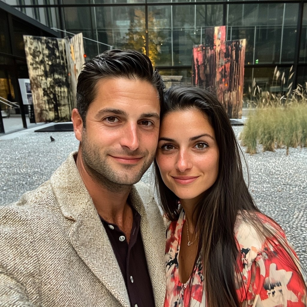 Создано на основе запроса: square selfie of a stylish man in his mid-40s, smooth clear complexion, clean dark hair, light jacket, standing with his radiant 23-year-old girlfriend, glamorous bone structure, model-like eyes, arm casually draped over his, colorful contemporary art installations behind in an outdoor courtyard, soft overcast light, f/30 simulation, no bokeh --- Автоперевод: Квадратный селфи стильного мужчины в его середине 40-х, гладкий чистый цвет лица, чистые темные волосы, легкая куртка, стоящая со своей сияющей 23-летней подругой, гламурной структурой кости, модельными глазами, рукой случайно набита на его, красочных современных художественных установках в открытом дворе, мягкий всхвет Неплохо вышло? 🤔 https://dzen.ru/id/65c0c65c86e4f837c27b24d7 #ИИ #AI #нейросеть #midjourney #art