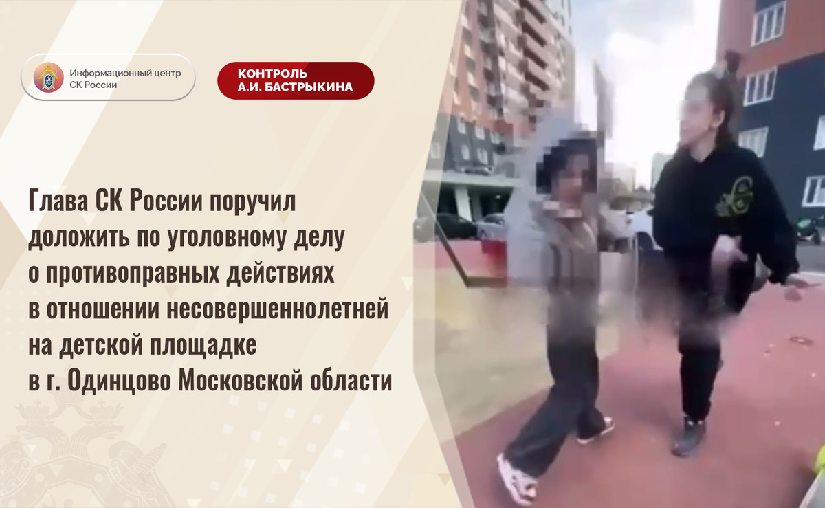 Глава СК России поручил доложить по уголовному делу о противоправных действиях в отношении несовершеннолетней на детской площадке в г. Одинцово Московской области В ГСУ СК России по Московской области возбуждено уголовное дело по признакам преступления, предусмотренного ст. 213 УК РФ (хулиганство). По данным следствия, на детской площадке одного из многоквартирных домов в городе Одинцово женщина неславянской внешности, используя малозначительный повод, напала на несовершеннолетнюю девочку, ударив ее по лицу. Указанная ситуация освещается в социальной сети. Председатель Следственного комитета Российской Федерации Александр Иванович Бастрыкин поручил руководителю ГСУ СК России по Московской области Ярославу Александровичу Яковлеву представить доклад о ходе и результатах расследования уголовного дела. Исполнение поручения поставлено на контроль в центральном аппарате ведомства. #СледственныйКомитет #СКРоссии #СКР #ИЦСКР #Информационныйцентр #АлександрБастрыкин #ПредседательСКР #КонтрольП