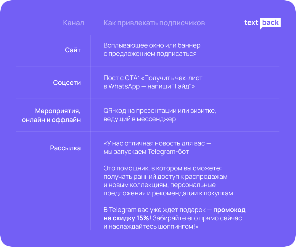 Хороший способ получить подписку — предложить что-то реально полезное: бонусы, участие в играх или регистрацию в программе лояльности. Главное — чтобы это было честно. Если человек подписался ради PDF-гайда, а получил сразу 10 сообщений с продажами — вы его потеряли.