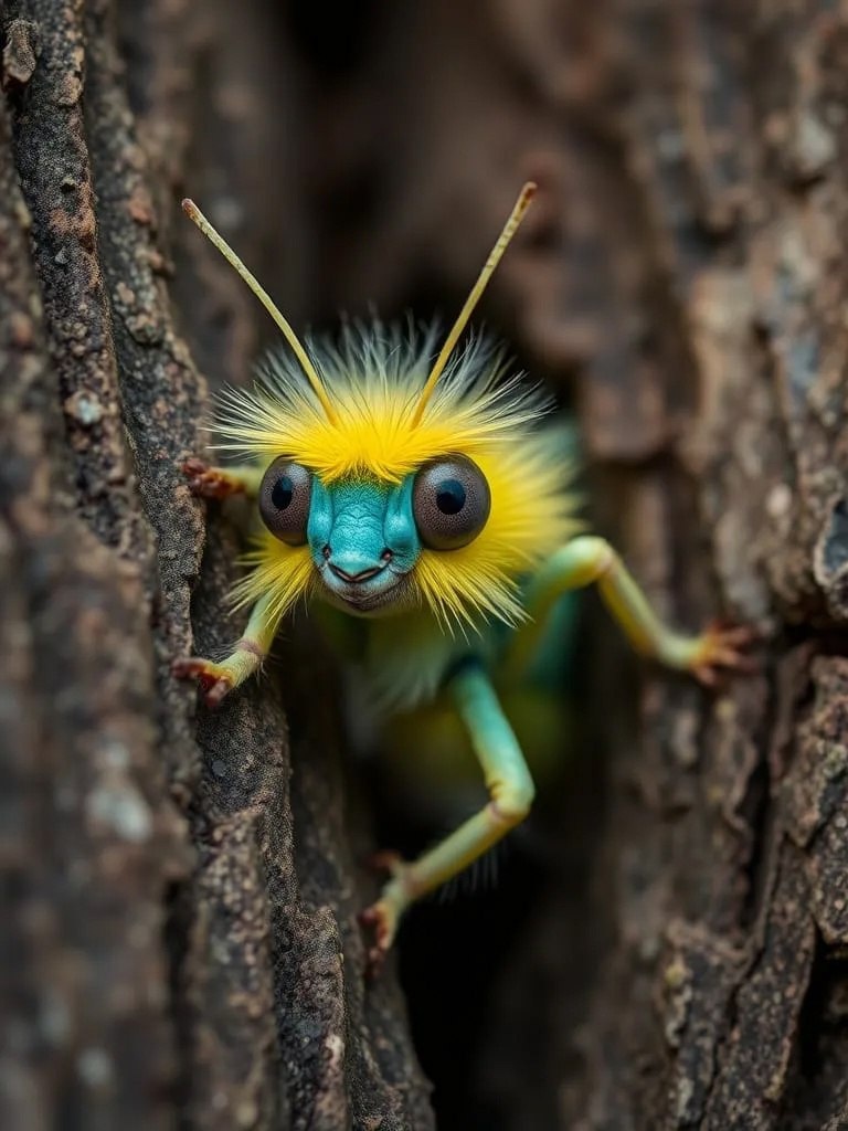 A cute little blue-yellow fluffy] funny, alien, grasshopper with big eyes, fluffy moth peeking out from behind a tree trunk, incredibly very