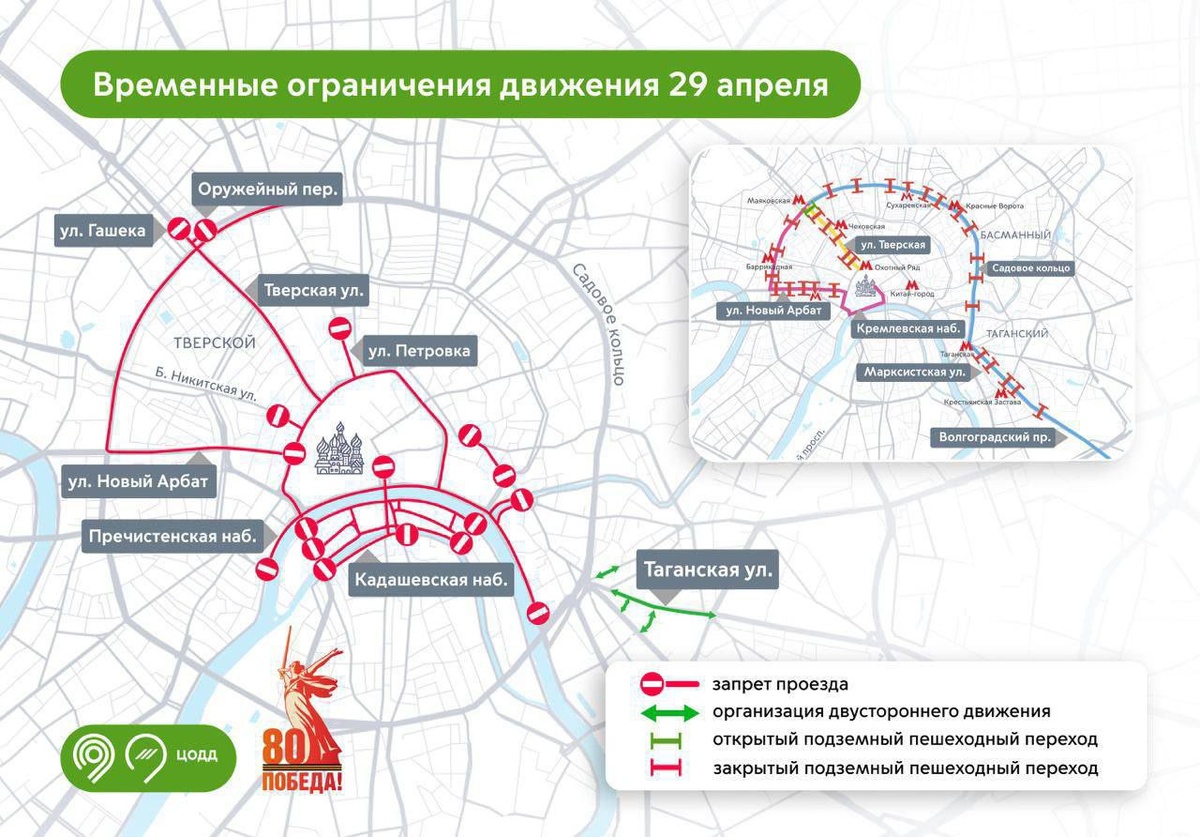 🚫 Временные ограничения движения вводятся сегодня с 16:30 в центре Москвы из-за подготовки к параду Победы