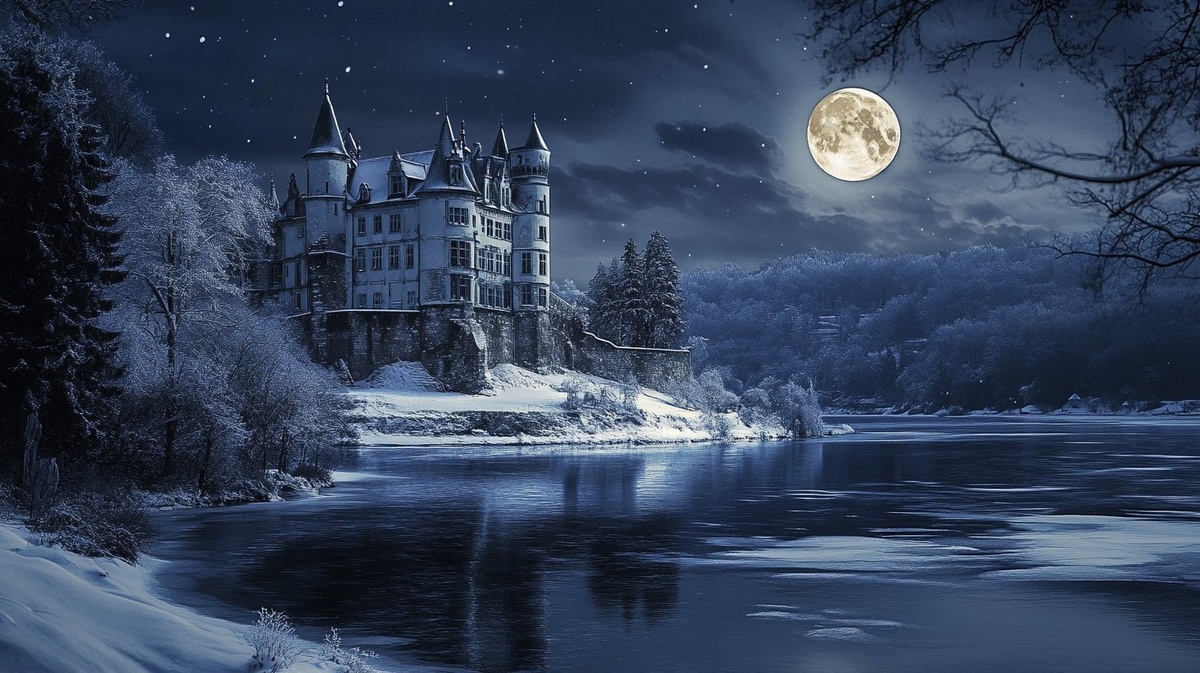 Создано на основе запроса: An 18th century white castle covered in snow under the moonlight on the riverside, realstic