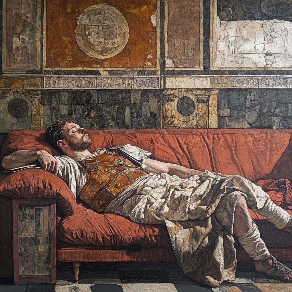 Создано на основе запроса: man reclining on couch day dreaming of ancient Roman baths