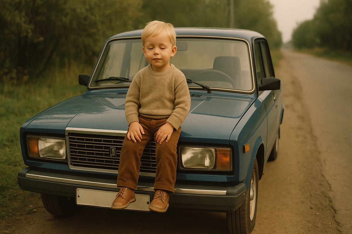 – Синий автомобиль припаркован у обочины, на капоте сидит мальчик с закрытыми глазами,