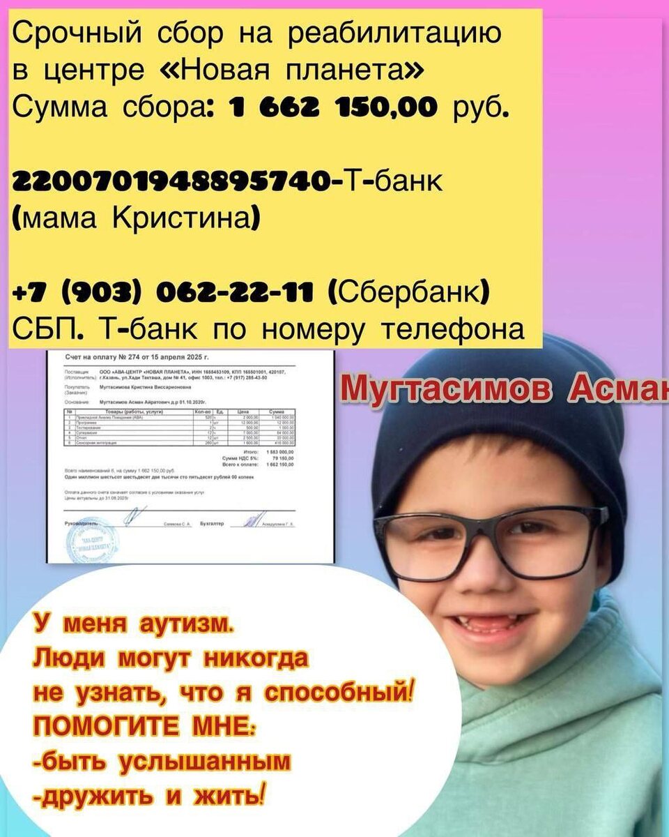 ❗️Карендәшебез оныгы ярдәм көтә❤️🙏🏽 «Туганайлар» редакциясенә, ярдәм итүебезне сорап, газетаның элекке җаваплы секретаре Евдокия Иванова шалтыратты. Аның оныгына ярдәм кирәк. Дүрт яшьлек Асманда – аутизм авыруы. Балага «Яңа планета» үзәгендә реабилитация үтү өчен, ашыгыч төстә, 1 миллион 662 мең 150 сум акча кирәк. Яшь гаиләнең андый мөмкинлеге юк😔 Әйдәгез, барыбыз бергәләп, карендәшебез Дусяның оныгына сөйләшү, яшьтәшләре белән аралашу мөмкинлеге бүләк итик🙏 Аның өчен, Асманның әнисе Кристина Виссарионовна Мугтасимова киң күңелле газета укучыларыбыз ярдәмен көтә (Сбербанк картасы телефонына бәйләнгән: +7-903-062-22-11).