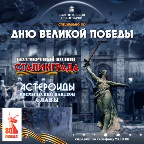 Звездный дом подготовил экспозицию, посвящённую героям войны, чьи имена увековечены в космосе в названиях астероидов. Открытие фотовыставки«Космический Пантеон славы» состоится 6 мая. Но уже сейчас волгоградцы могут познакомиться с материалами экспозиции в электронном варианте, отсканировав QR-код на уличных макетах перед планетарием. В продолжение памятной темы горожанам и гостям города-героя предлагается посетить лекционную программу с одноименным названием. В ней пойдет речь о великих людях и выдающихся исторических событиях, в честь которых астероид № 2021 получил имя «Ветерания», а астероид № 2250 носит имя нашего героического города «Сталинград». Космическим памятником Великой Победе стал астероид № 1908 «Победа». Как рассказали в планетарии, за каждым именем – подвиг. Создание Космического Пантеона славы – это дань памяти героям, которые отстояли мир! Показы пройдут 8,9, 10, 11 мая. 6+