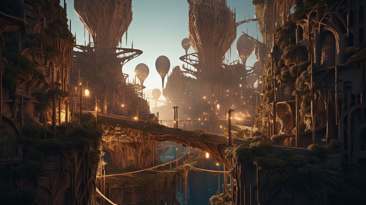 Автоперевод: Сюрреалистический город, построенный из светящегося мицелия, органической архитектуры, световых башен, корней и виноградных лоз, покрывающих древние руины, футуристические и священные чувства