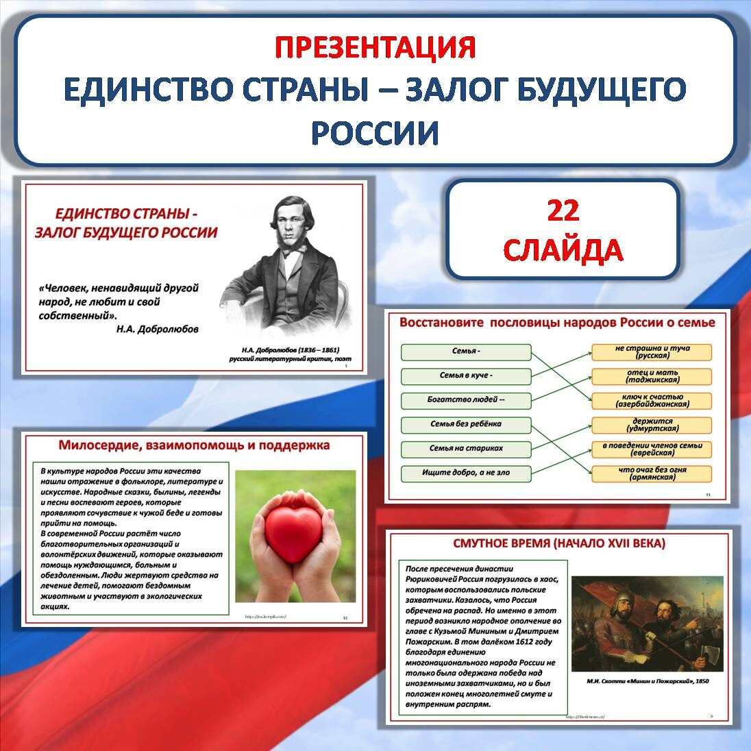Презентация «Единство страны - залог будущего России» разработана к уроку ОДНКНР в 5 классе в соответствии с ФОП. Презентацию можно использовать как отдельно, так и в комплекте с рабочим листом (ссылка дана ниже) Презентация состоит из 22 слайдов. Слайды № 11, 13, 15, 18 анимированы. Слайд № 1. Титульный слайд. Высказывание Н.А.Добролюбова «Человек, ненавидящий другой народ, не любит и свой собственный». Слайд № 2. Единство России – не только географическое понятие. Слайд № 3. Единство народов России - в общей истории. Слайд № 4. Единство народа в трудные для страны времена. Слайд № 5. Смутное время (начало XVII века). Слайд № 6. Отечественная война 1812 года. Слайд № 7. Великая Отечественная война (1941-1945). Слайд № 8. Русская культура – объединяющий фактор. Слайд № 9. Сходство культурных традиций народов России. Слайд № 10. Семья – общая ценность народов России. Слайд № 11. Восстановите пословицы народов России о семье. Слайд № 12. Милосердие, взаимопомощь и поддержка. Слайд № 1