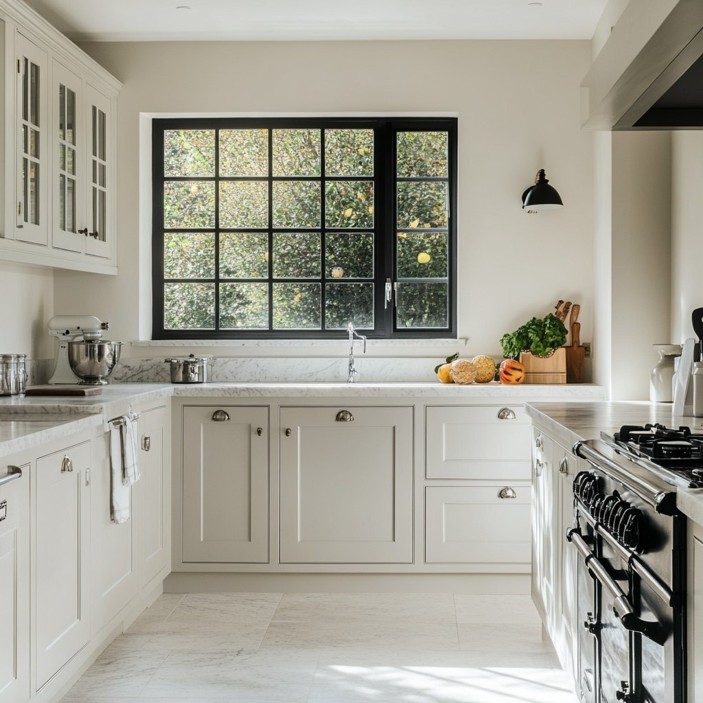 Создано на основе запроса: A bright, traditional white kitchen with shaker cabinets, marble countertops, and a large window letting in