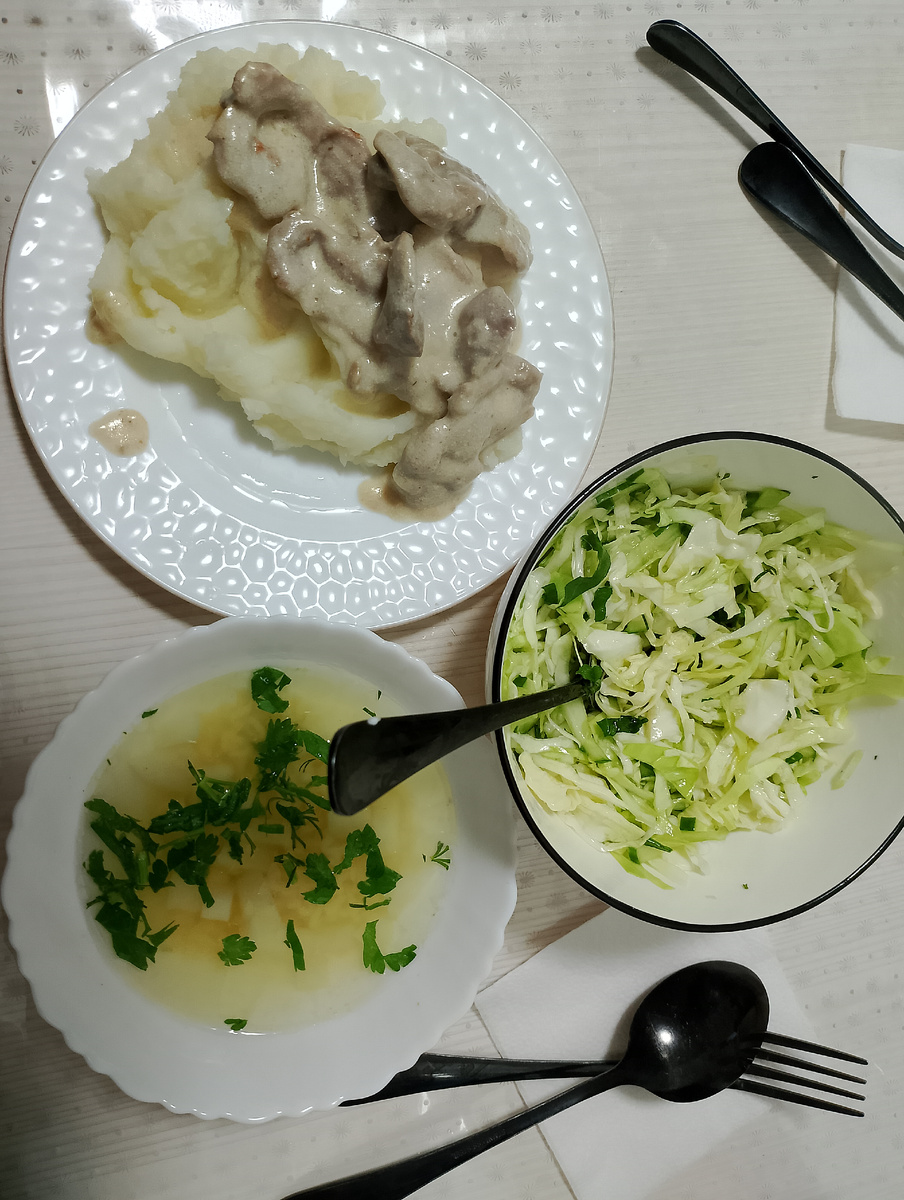 На фото — идеальный вариант обеда, который сочетает в себе пользу, насыщенный вкус и домашний уют: 🥔 Нежное картофельное пюре– воздушное, с легкой сливочной ноткой. 🍗 Куриные желудочки в сливочном соусе – мягкие, ароматные, тающие во рту. 🥗 Свежий салат из капусты, огурца и зелени – хрустящий, витаминный, с ярким вкусом. 🍜 Ароматный куриный суп – наваристый, с лапшой и зеленью. Такой обед не отнимет много времени на готовку, но подарит настоящее удовольствие и чувство сытости надолго. 🔹 Почему это хороший выбор? ✔ Сбалансировано: белок, клетчатка, углеводы. ✔ Бюджетно: простые и доступные ингредиенты. ✔ Вкусно: проверенные сочетания, которые нравятся всем. А вы любите такие домашние обеды? Какое ваше любимое сочетание блюд? Делитесь в комментариях! 👇 #ПравильноеПитание #ДомашняяЕда #ВкусныйОбед #ПростаяЕда #ЗдоровоеМеню
