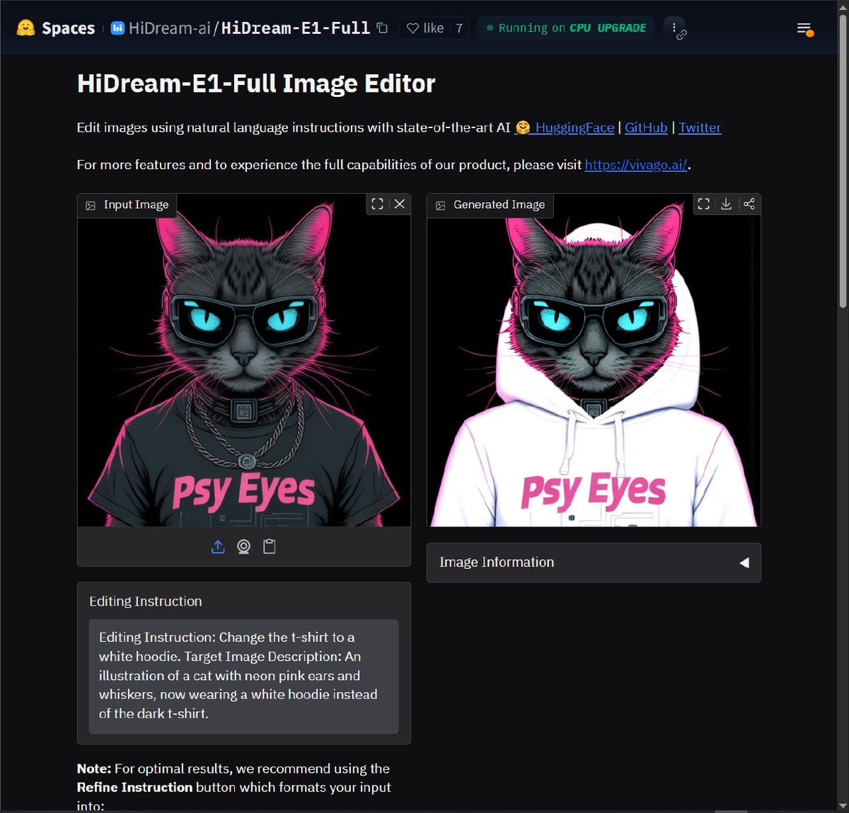 HiDream: выпустили редактор картинок текстом E1 на основе своей модели HiDream Full. Загружаем изображение, задаём промт с нужными изменениями + шевелим настройки по желанию, и генерим. Результаты пока не впечатляют. Отрабатывает поверхностно, в лучшем случае теряя детали. Причём, как с включенным улучшателем промта, так и без. Пока можно использовать для быстрых драфтов и компоновки мудборда. Демо Гитхаб ———————————————————— 🔥 Создай своего цифрового двойника, оживи персонажа, или интегрируй бренд. Напиши — @AndreyBezryadin