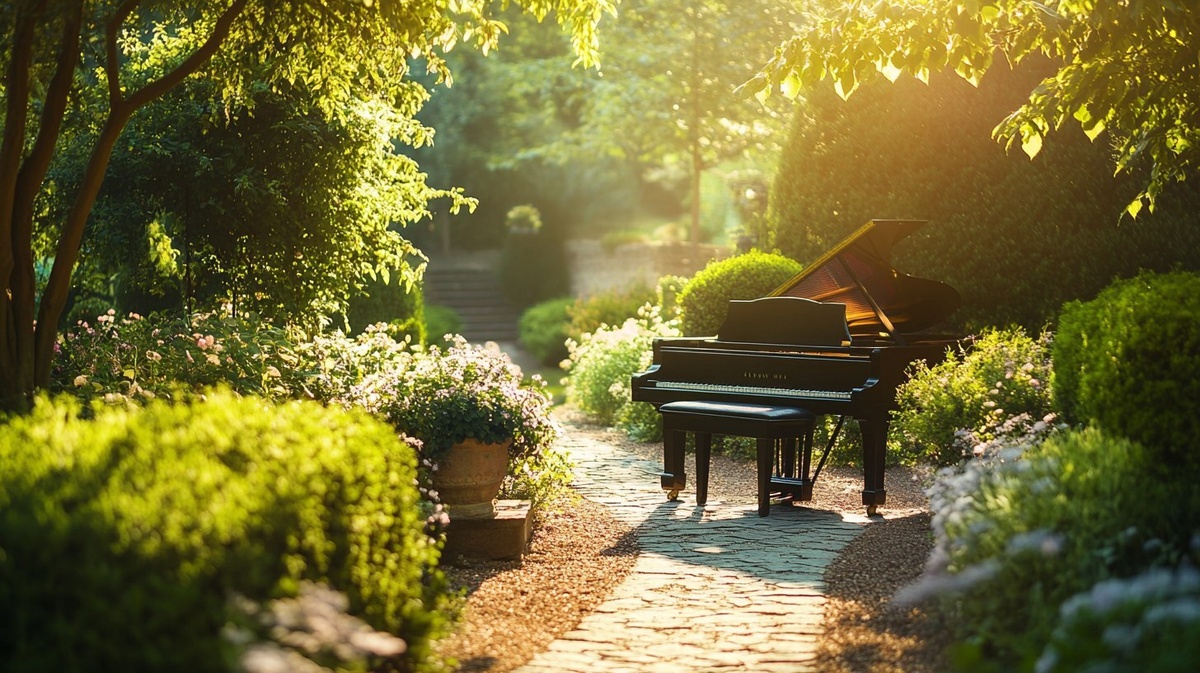 Создано на основе запроса: Garden in the sun, soft lighting, pianist's hands